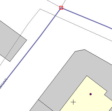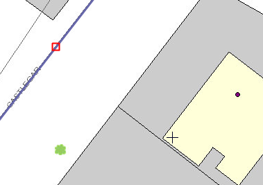 The new feature you add is snapped to the closest part of the selected snap feature. The crosshairs cursorindicates where a new feature, an address point, is about to be added. The selected snap feature, a road, is highlighted in blue. The red square icon