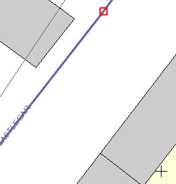 The new feature you add is snapped to the end of the closest segment of the selected snap feature. The crosshairs cursorindicates where a new feature, an address point, is about to be added. The selected snap feature, a road, is highlighted in blue. The red square icon