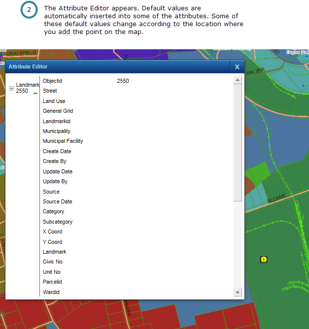 • In the example shown in Figure 358 , the user has placed a Landmark point on the border between two wards. The map administrator has configured the City Ward attribute on the Landmarks layer so that the default value for City Ward will be sourced from the Wards layer when users add a Landmark point on the map. Since there is more than one ward to choose from, a drop-down list is provided in the Attribute Editor from which users choose a value.