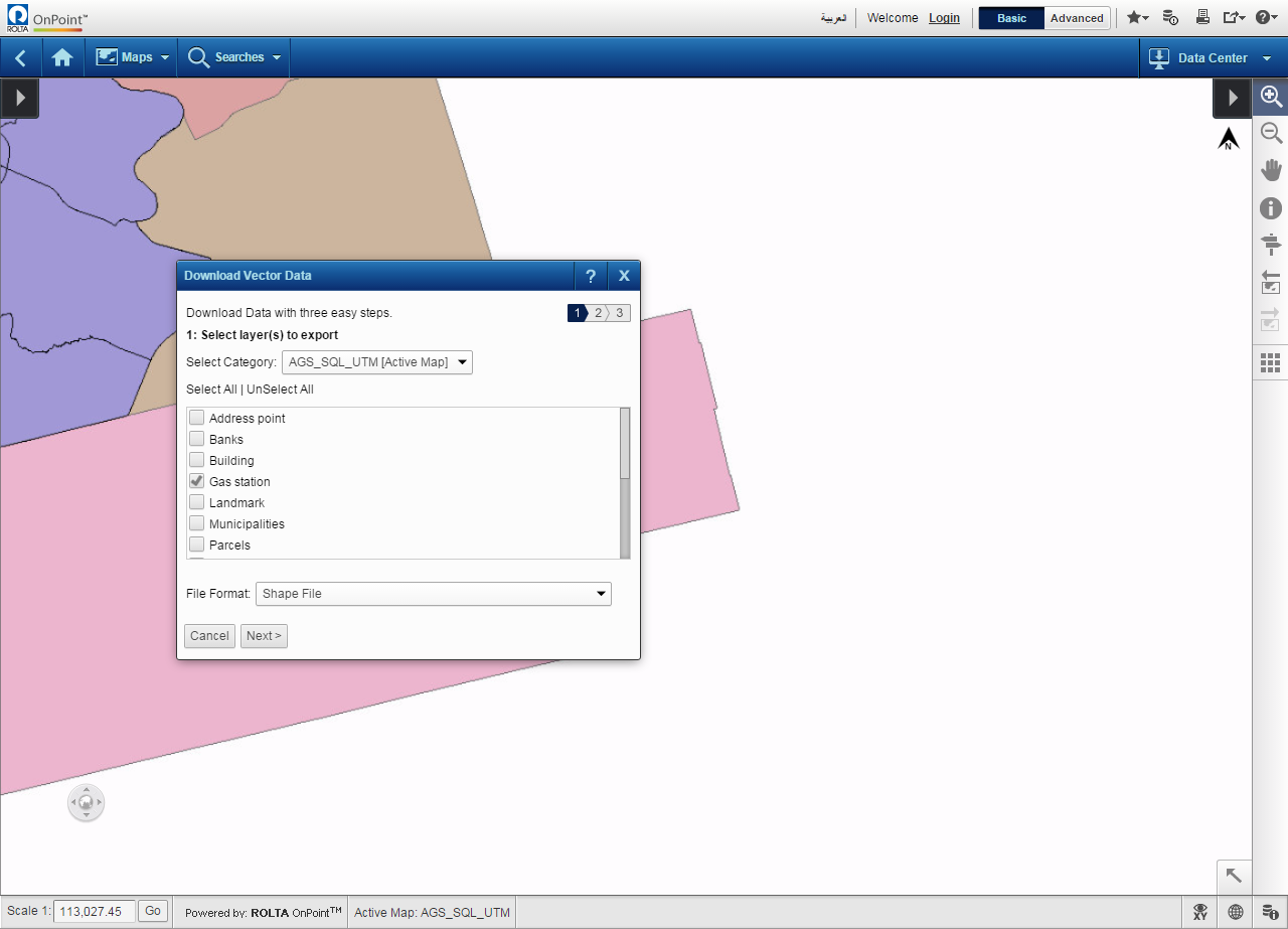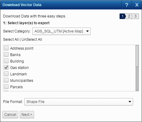 You can download vector layers in the OnPoint web-GIS application. Permission to download vector layers may vary for different user groups. You can select either GIS format or CAD format for the data to be downloaded.
