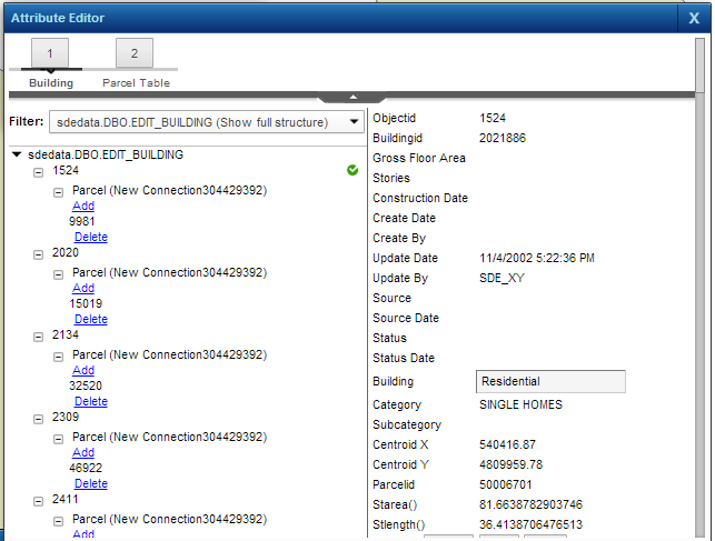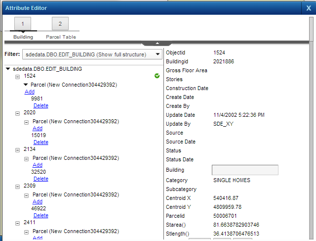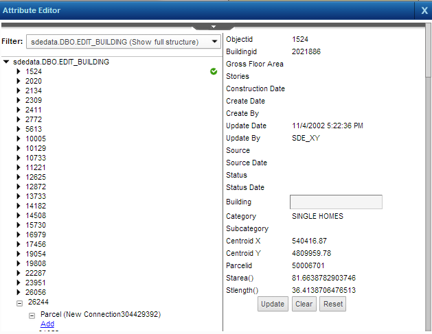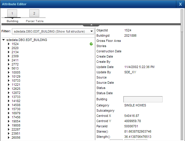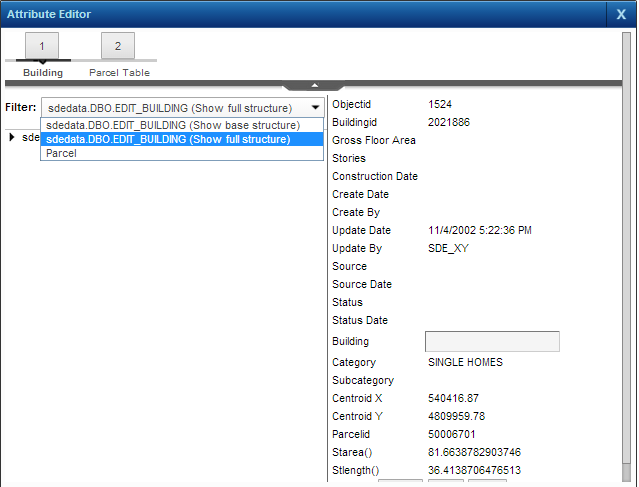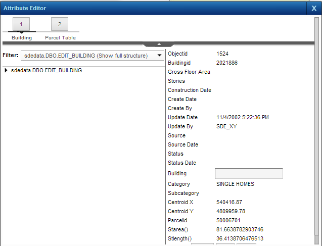 The Attribute Editor window is where you add or change attribute information for a map feature. Attribute data describes the nongeographic characteristics of map features. You use the Attribute Editor to add or edit this nongeographic data, as opposed to using the Editing tools directly on the map to alter the boundaries of existing map features or to draw new ones. You can access attribute data for a feature by performing a search or selecting that feature on the map.Attributes can be several levels deep—you can tell if an attribute group has related data if it shows a plus icon beside the group name. If a feature has several levels of nested attribute information, it may be easier to select the attribute group that you want to edit from the Filter field instead of expanding each section.