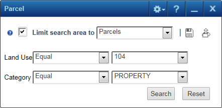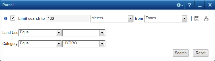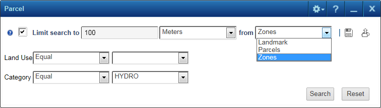 A search can have a Limit search area to option that restricts a search area to within or crossing the boundaries of features from a previous search or selection. The Limit search area to option is typically used with map features that are large enough that other features can be contained within them, such as regions, communities or zones. This feature can also be used with map features that can not have other features contained within them when you specify an extended area around the feature so all items within this area are included in the search results. An example of this type would be to find all recreation centers within 2 km of any selected school. A 2 km distance is added around the school and the search locates all recreation centers within this area.This option only appears if it has been configured for the search and you have performed a search or selection before opening the current search. If you have multiple groups in the Results window, you can choose the group you want to use from a drop-down arrow to the right of the Limit search area to option.