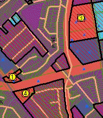 5. Specify the remaining criteria you want the search to take into account and click Search. In the example shown in Figure 123 , neighborhood parks are displayed on the map with yellow numbers within previously selected zones that are outlined in black.