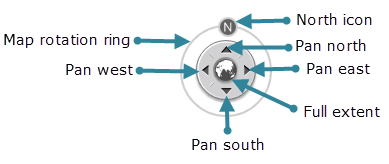 Map navigation buttons When viewing a map, several buttons display in the lower-left corner of the map that allow you to quickly pan or display the full extent of the map. You can also rotate the map using the Map rotation ring. Drag the north icon along the map rotation ring to rotate the map. Note that the north icon would always point in the north direction of the map. Double-click the north icon to reset it to its original position. Figure 1 Map navigation buttons