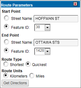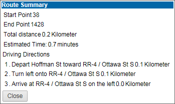 3. Select the route type and units and click Get Directions.The Route Summary window opens showing the route information including the start and end locations, total distance, estimated time and driving directions.