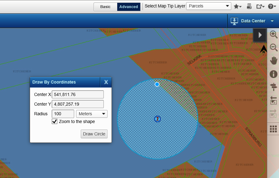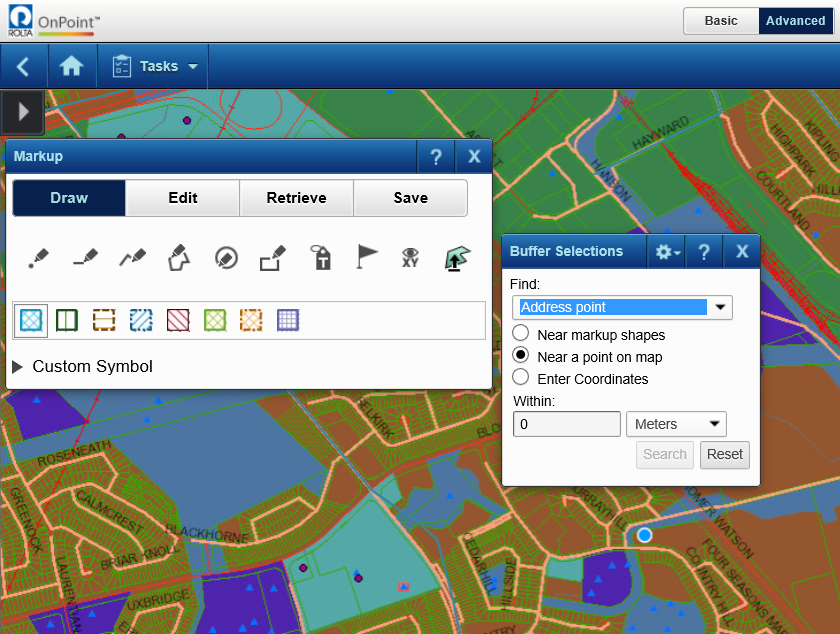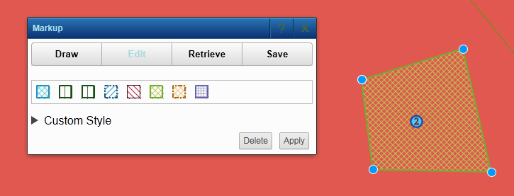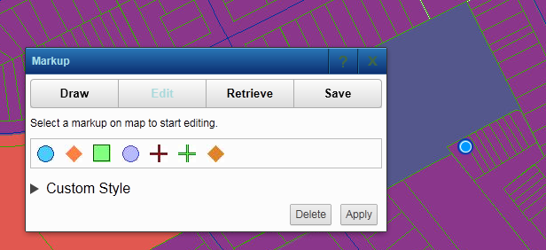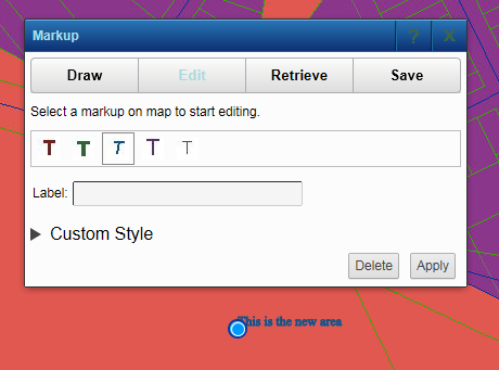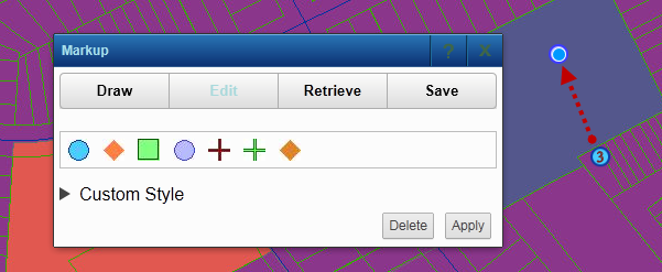 The map markup feature allows you to draw points, lines, polygons, circles and labels directly on the map for custom notes and illustrations. There is a change in the way a circle or rectangle is drawn. After adding all your custom shapes and labels to the map, you can save your markup so it can be retrieved at a later time.
