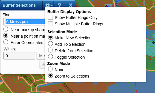 c. In the Zoom Mode section, select either Zoom To Selections to have the map zoom in or out to show the buffer area or None to have the map remain at the current map scale.