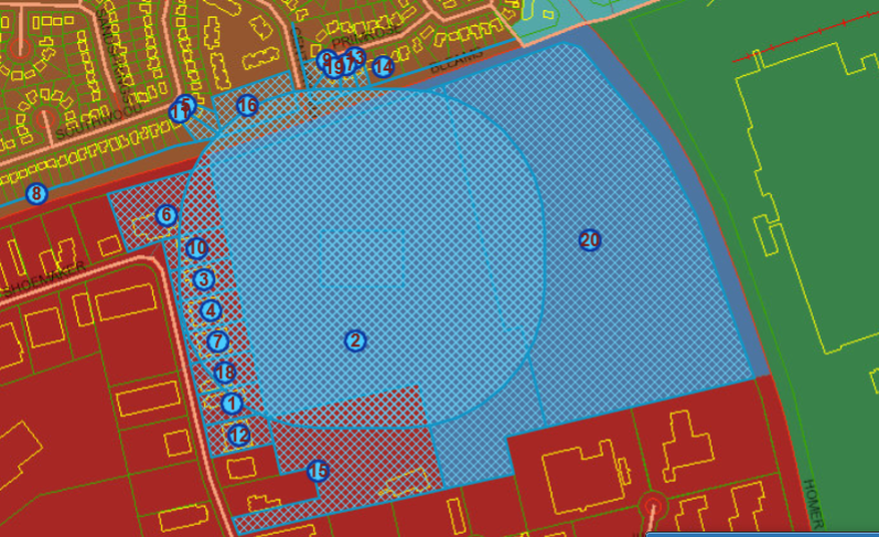 a. In the Buffer Display Options section, neither option is available. A single buffer ring is drawn around the map markup shape as shown below.