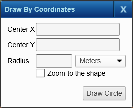 If you do not have coordinates for the center of the circle, you can use the Measure tool to obtain them.In the Tools menu, select the Measure tool, the Point tool , and then click a position on the map to obtain its X, Y coordinates.Make sure the coordinate system specified in the Measure tool is the same as that specified in the Draw by Coordinates tool.