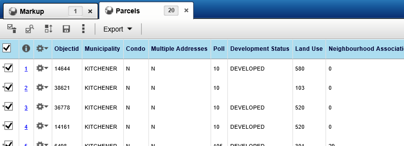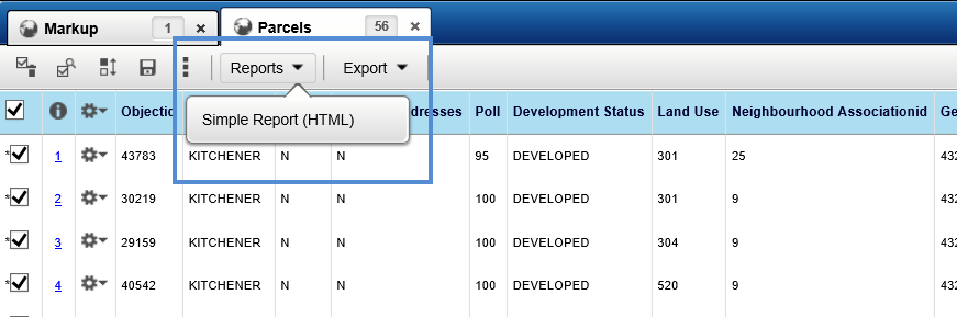 • If reports for buffer selections have been configured by your map administrator, reports containing the data you selected with the buffer tool can be accessed from the top left corner of the Results window.