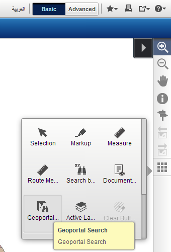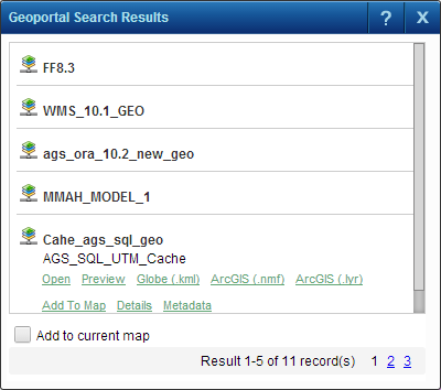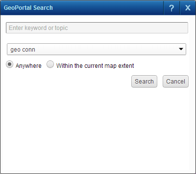Performing a Geoportal search in OnPoint You can search for map data, metadata or any other elements held in Geoportal using the Geoportal search tool in OnPoint. 1. If the Map Tools pane is not expanded, in the map viewer, click the Map Tools button. 2. On the Map Tools pane, click the More Tools button and then select the Geoportal Search tool. Figure 394 Selecting the Geoportal Search tool The Geoportal Search dialog box appears. Figure 395 Searching for map data in Geoportal using the Geoportal Search tool in OnPoint 3. In the text box in the upper left corner of the dialog box, enter a keyword or topic that identifies the map data you are looking for. 4. In the Select Geoportal Server drop-down list, select the Geoportal site where you want to search for map data. 5. You must indicate the geographic area in which you want to search. You have these choices: Table 42 Options for indicating coverage area in a Geoportal search Option Description Anywhere A search is carried out in the entire area covered by the map in OnPoint. (Click the Full Extent control on the direction indicator to view the full coverage of the map.) Within the current map extent A search is carried out only in the currently displayed portion of the map in OnPoint. 6. Click the Search button. 7. View the results and click the Details or the Metadata link to view more information in Geoportal. Figure 396 Viewing Geoportal search results