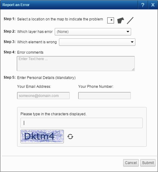 The Report Data Error feature enables you to report any spatial data error that you encounter. Spam error reporting is prevented with the implementation of CAPTCHA.