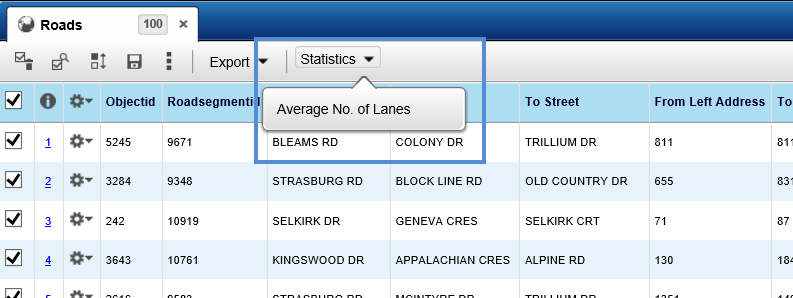 If your map administrator has added custom statistical expressions, you will notice a Statistics drop-down menu on the top of the Results window after you have made a selection or performed a search. Select the Statistics drop-down menu and then select the option you want to run. The expression takes into account all of the selected results in the Results window.