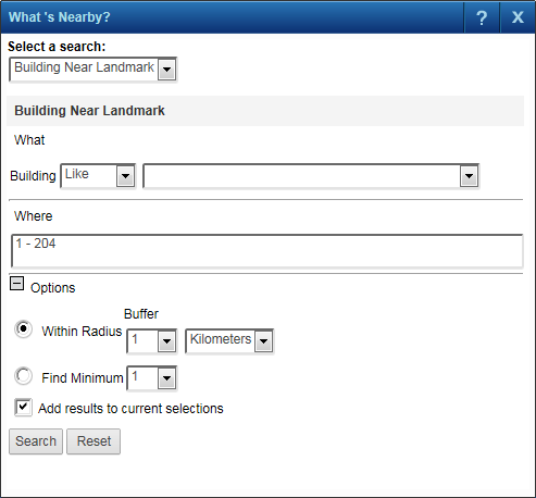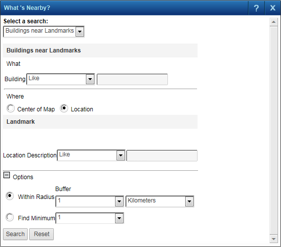 6. In the Options section, search either by defining the radius of the circle or by entering the minimum number of features to include. The information you provide depends on how the search was configured.