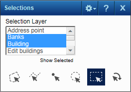 Select by polygon Allows you click several points on the map to create a polygon (double-click to complete the shape). All items for the selected group (layer) within the polygon will be included in the list. Allows you to click points on the map to draw multiple connected lines that includes all features from the selected layer if touched by the line (double-click to complete the line). Select by point Allows you to select a single item on the map for the selected layer. Draws a circle that will include all items within the circle for the selected layer. Select by rectangle Draws a rectangle that will include all items within the rectangle for the selected layer. Retrieve selections Allows you to apply previously saved selections or results.