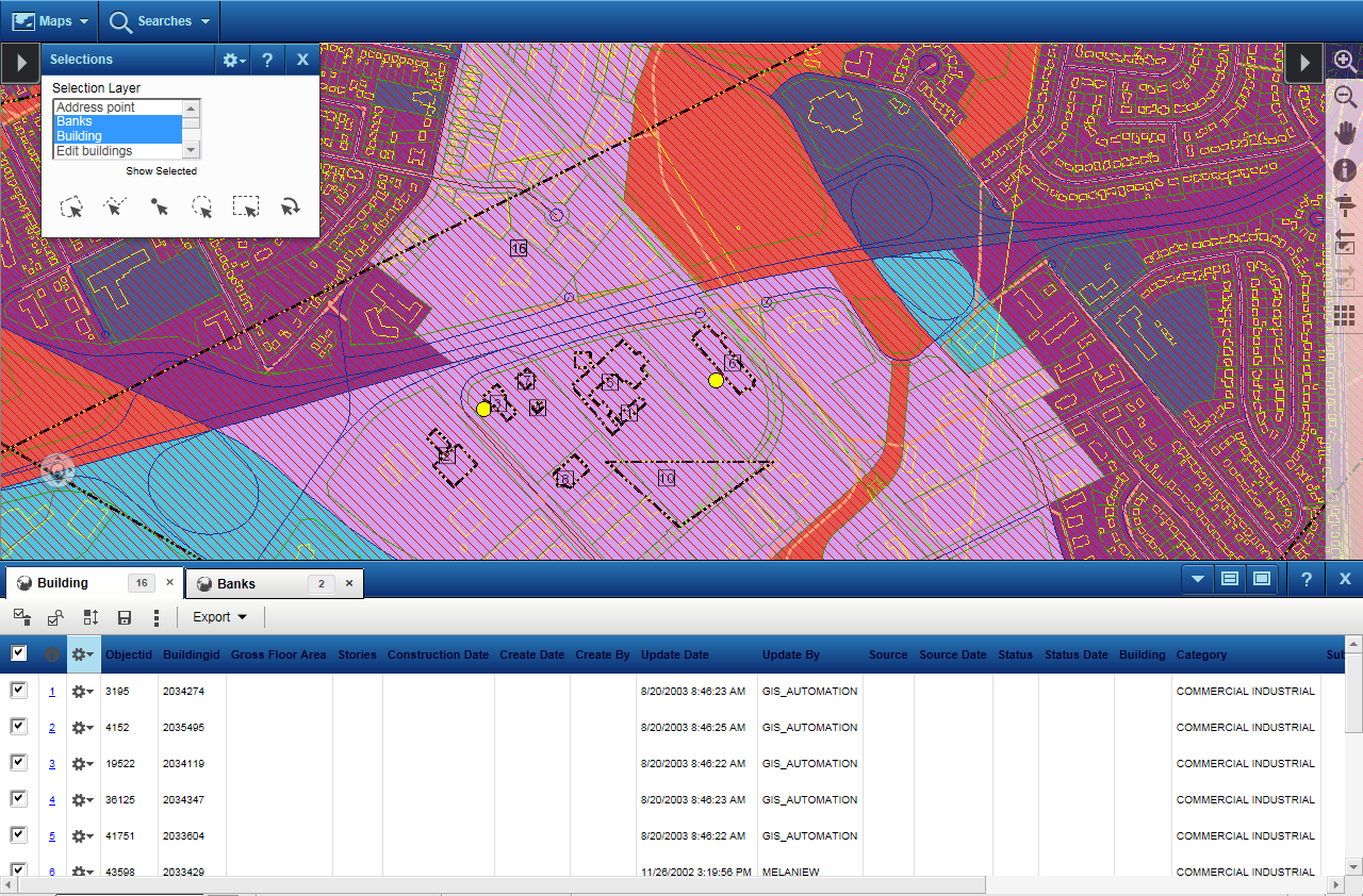 • Figure 170 shows a selection that has been made on two feature groups or layers, namely Buildings and Banks. Notice a result set with tabs for features belonging to each feature group is displayed.