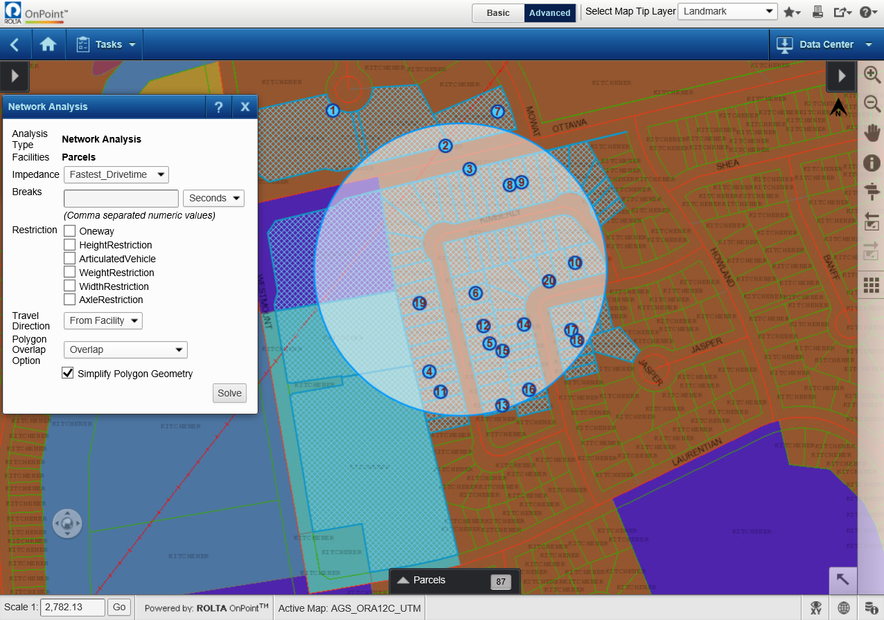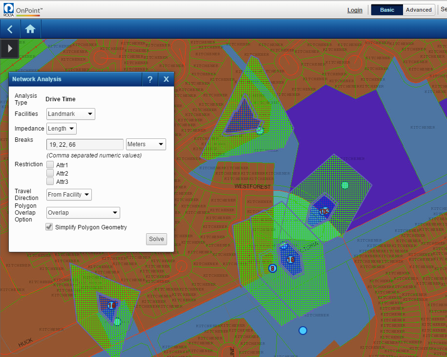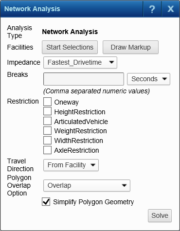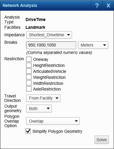 If you drew a markup shape to be the focal point of the service area, Markup is shown here. For example, if you selected a school as the facility for which you wanted to calculate a service area, and set Impedance to Time, and specified 10, 15, 30 in Breaks and selected Minutes. Three concentric service areas would be plotted on the map, showing three concentric service areas radiating from the school from where travel time to the school is 10, 15 or 30 minutes.