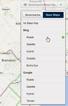 If multiple base maps have been configured for your application, you will notice that there is a drop-down list of base map views to choose from in the upper right corner of the map viewer.