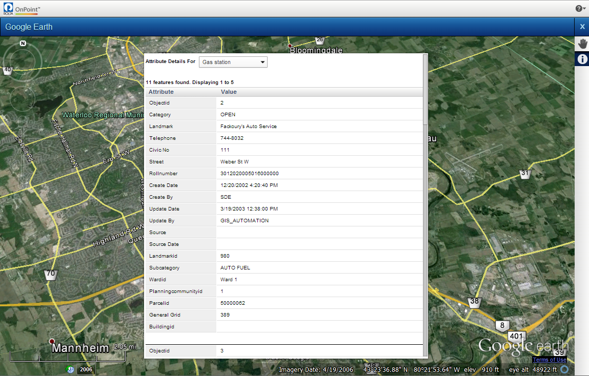 The Identify tool is available when viewing a Google Earth map. Similar to when you use it in other maps, the Identify tool shows you related or additional information about a feature on the map.