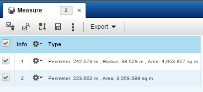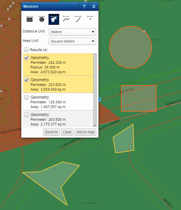 After you draw a shape on the map, the information about the shape is displayed in the Measure dialog box. You can draw multiple shapes on the map and add, remove, or zoom in to these shapes using the Measure dialog box.