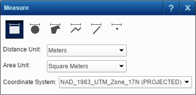 Draws a rectangle to measure area and perimeter. Draws a circle to measure area and perimeter. Draws a polygon to measure area and perimeter. Measure Multisegment Draws multiple connected lines to measure distance. Allows you to click a point on the map to view the coordinates.