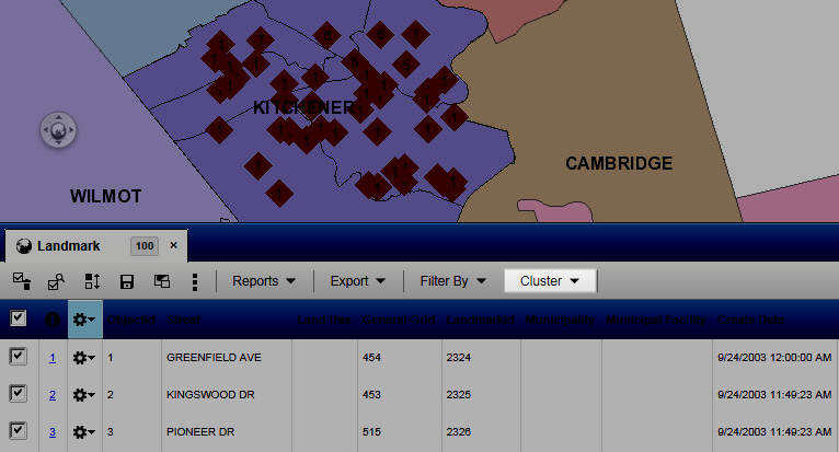 If your map administrator has enabled clusters for feature groups that display as points on the map, you will be able to see them represented as clusters after you have performed a search or selection (while the map is at a scale your administrator has configured for clusters). Clusters are groups of map features that display as one group when the map features occur close together. Cluster size changes with the scale of the map. The closer you zoom in, the less likely you will see clusters. If more than one group of map features has been set up to display in clusters, you will notice a Cluster drop-down menu on the Results window after performing a search or selection. See Figure 174 . Clusters can represent a number of map features or the sum of the numeric attributes belonging to a group of map features. See below for more information.