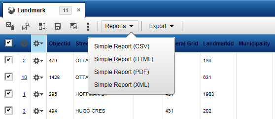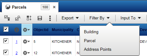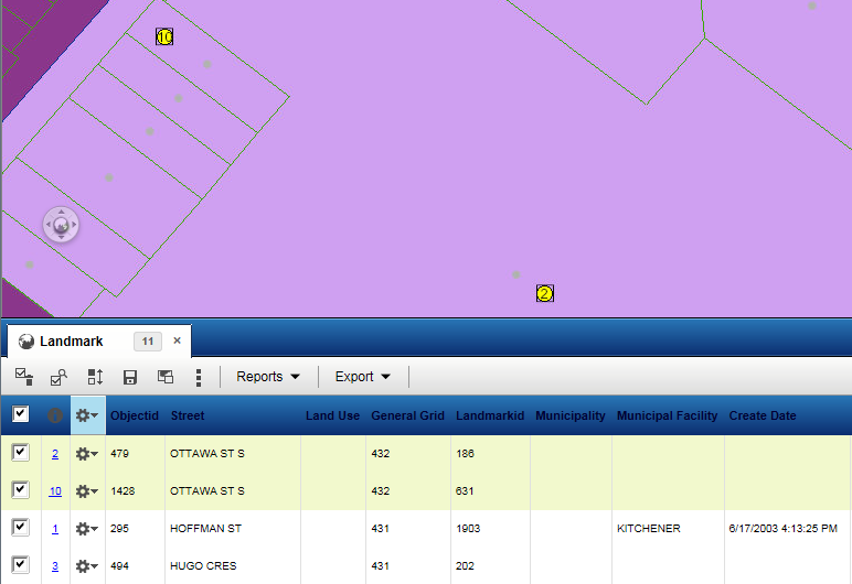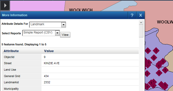 The Results window displays multiple columns of information for each item in a window at the bottom of the map viewer. Information displays in the Results window as the result of a search or selection on the map. Additional tools are available to you on the Results window. You can also access some of them by selecting the More drop-down menu. In addition, you can access record-related tools using the Other Options button