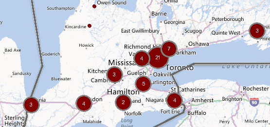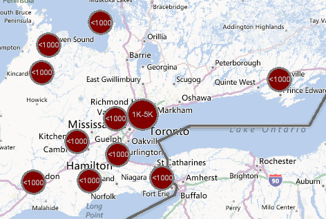 If a collection of points occur close together on the map, they are displayed as one symbol whose size is proportionate to the number of map features the cluster represents. The number of map features the cluster represents is displayed as a label. In the example shown in Figure 175 , each cluster represents a number of businesses.
