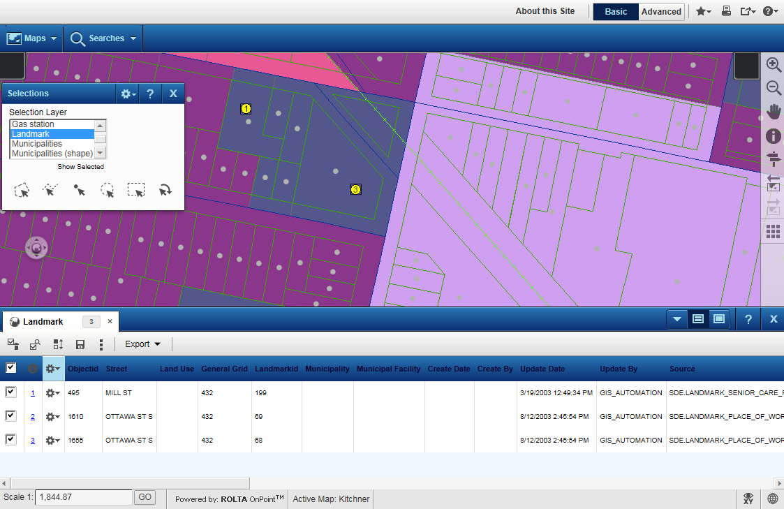 Closes that group of the Results window and removes those features from the map. This is the default view of the Results window where the map is visible in the upper section of the screen and the Results window is visible in the lower section of the screen. In Full view, the Results window is displayed on the entire screen. This enables you to view more records at a time. Expand Results window Expands the Results window to display search or selection results. Remove selected Removes only selected items from the list and from the map. Zoom to selected Zooms the map to a level where all items selected in the list or group display in the map. Toggle active selection Clears the check box for currently selected features and selects the check box for features not selected. Save selections Saves the list so you can display it at a later time. Lists can be saved as public or private. Highlights visible features on the map in the Results window and displays the selections on the top of the Results Window. For more information on the Highlight feature, see Highlighting results related to the currently displayed map features Statistical tool Calculates statistics for numeric and geometric fields. This tool is available in the More drop-down menu. Toggle indexing Selected features on the map will have a map symbol with a number that corresponds to the number listed in the list. Clicking the list number displays additional information about that feature. If the number of selected items exceeds what can be shown on the list, additional pages will be available and as you move to the next page, the index labeling on the map will change to match the list. This labeling can be turned off by clicking the Toggle Indexing option. This tool is available in the More drop-down menu. Zooms the map to a level where all items in the list display in the map regardless of whether they have their check box selected or not. This tool is available in the More drop-down menu. Clear buffer rings Removes any buffer rings that were added to the map previously. This tool is available in the More drop-down menu. Document viewer Opens a new window with documents or maps that can be viewed or purchased. This tool is available in the More drop-down menu. Opens the Chart window so you can create a chart with map data. This tool is available in the More drop-down menu. View Thematically Helps assign distinguishing colors or symbols to map features according to the value of that feature to help you recognize patterns or trends. This tool is available in the More drop-down menu. For more information on Thematic mapping, see Using thematic mapping Edit Attributes Helps you edit the attributes of the record. However, editing should be enabled on the layer in the OnPoint Administration Console. Zoom to Feature Clear Selection Removes the selection from the map and the Result window Show on Map Exports selected results as a .kmz file. A .kmz file contains compressed keyhole markup language (kml) files, which can be viewed in applications that can open that file format, such as Google Earth. This drop-down contains two options—Export Selection to KMZ and Export All Selections to KMZ. After performing a search or selection, click the Highlight tool in the upper left of the Results window to highlight the data entries on the Results window related to the features currently displayed on the map. The Results window refreshes and sorts the data entries so that those belonging to the currently displayed map features are near the top of the window.