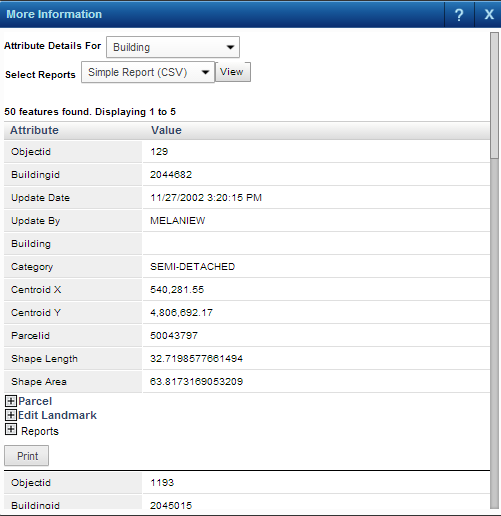 2. From the Attribute Details For field, select a different feature type to display information for the selected area.
