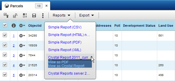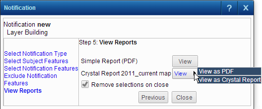 4. After you have selected the type of report to be generated, click View to open the report in the selected format.Certain reports types offer the choice of allowing you either to open the report in the report viewer window or as a .pdf. When you click the View button, select either View as Crystal Report or View as PDF. If you cannot see these options, these options are not available for this report type. For more information, see Viewing Crystal Reports.