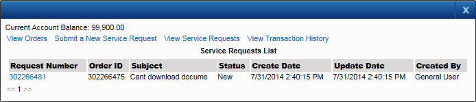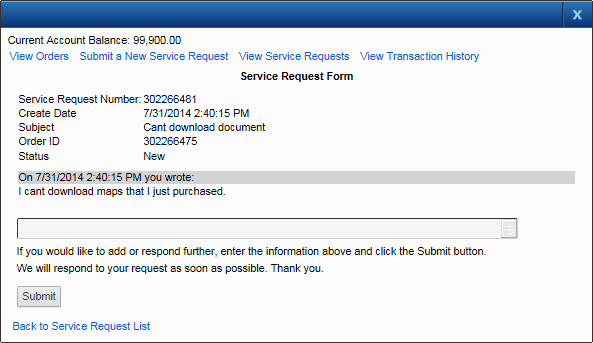 Viewing service requests After creating a service request, you can view it by clicking the Account button. 1. In the map viewer, log on using your credentials. 2. At the right side of the toolbar, click the Account button and View Service Requests. All previously created service requests associated with your account are displayed. Figure 352 Details for service requests 3. Click the request number. The details for the service request is displayed. Figure 353 E-commerce service request details 4. If you want to add more details, type any additional information in the text area and click Submit.
