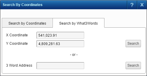 1. In the Search by Coordinates window, click the Search by What3Words tab.